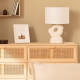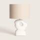 La base de la Lampe à Poser Céramique Illinois est en céramique blanche, travaillée à la main jusqu'à ce qu'elle atteigne sa forme définitive. Elle est accompagnée d'un abat-jour en tissu finition beige.