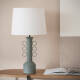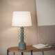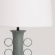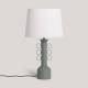 Le corps de la lampe est en métal laqué et se distingue par ses détails ornementaux circulaires disposés symétriquement qui évoquent un langage décoratif graphique et intemporel. Disponible en trois finitions : bleu nuit, beige pierre et vert olive, il s'adapte facilement aux palettes de couleurs neutres ou naturelles, ce qui renforce sa valeur décorative.