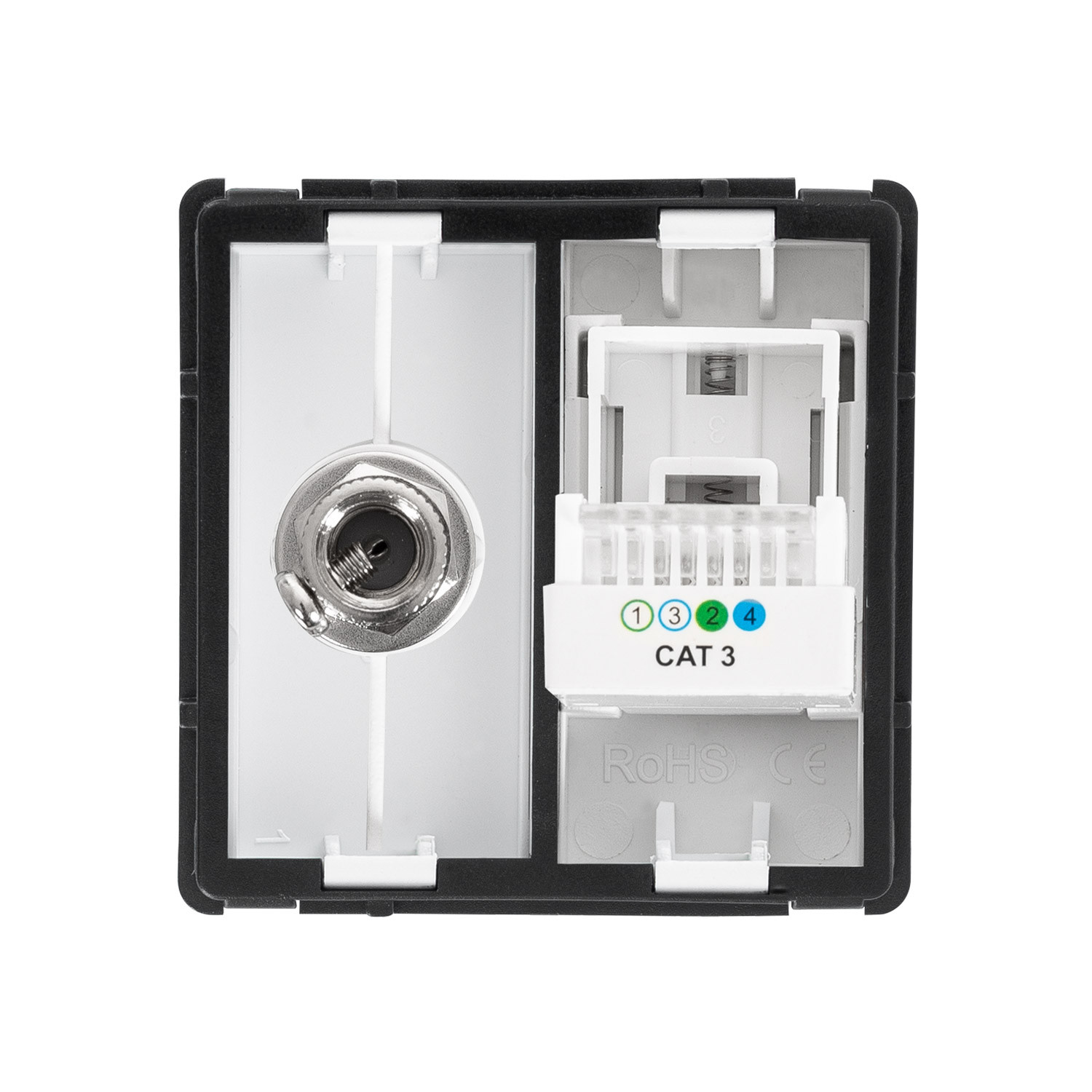 This module for telephone and Satellite is made up of an RJ11 outlet and a satellite outlet. This module is of the standard size and is compatible with most recessed back-boxes and surface mechanisms. With a glass frame that's available in the accessories section, it will provide a very professional look.