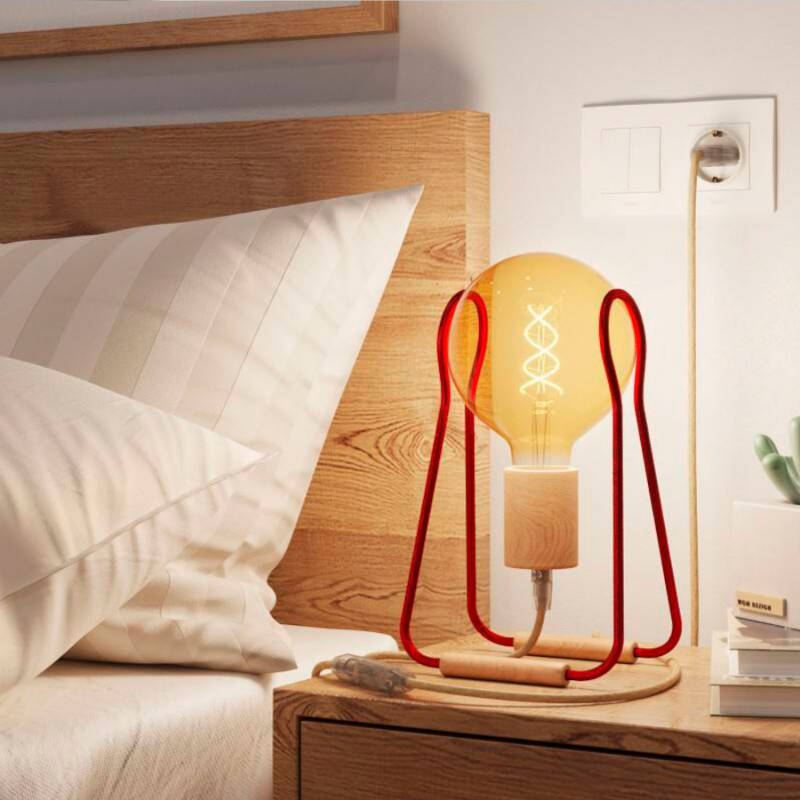 The Creative-Cables Model KTCH0_ Taché Table Lamp is inspired by one of the most beloved objects in the world of design: the paperclip, patented by William Middlebrook in 1899, of an object that reproduces simplicity and elegance. It is designed to create the effect of holding a suspended globe, which is why we recommend using a G125 bulb. It is composed of two wire arms covered in textile and two wooden supports.