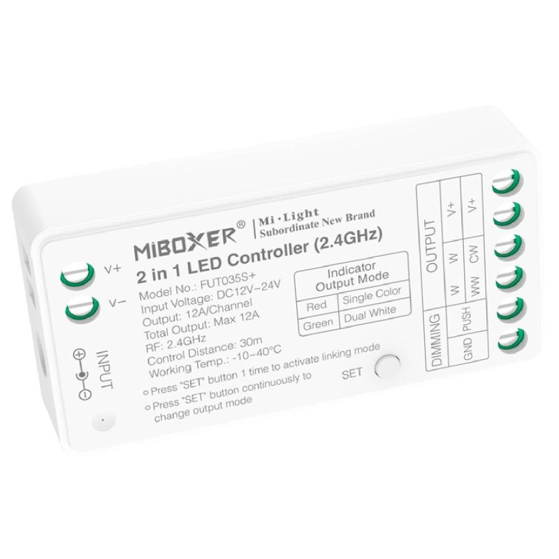 Appositamente progettato per controllare strisce LED monocolore e CCT 12-24V DC, questo controller fornisce una gestione dell'illuminazione precisa ed efficace. È possibile regolare l'intensità della luce utilizzando un pulsante convenzionale . Inoltre, il controller è dotato della tecnologia RF a 2,4 GHz, che offre la possibilità di essere controllato tramite telecomandi con una portata impressionante fino a 30 metri. Possiamo anche abbinare questo prodotto al controller WiFi MiBoxer 2.4GHz Gateway WL-box1 e controllare le strisce LED direttamente dal tuo smartphone tramite una connessione WiFi, ampliando le possibilità di gestione dell'illuminazione.