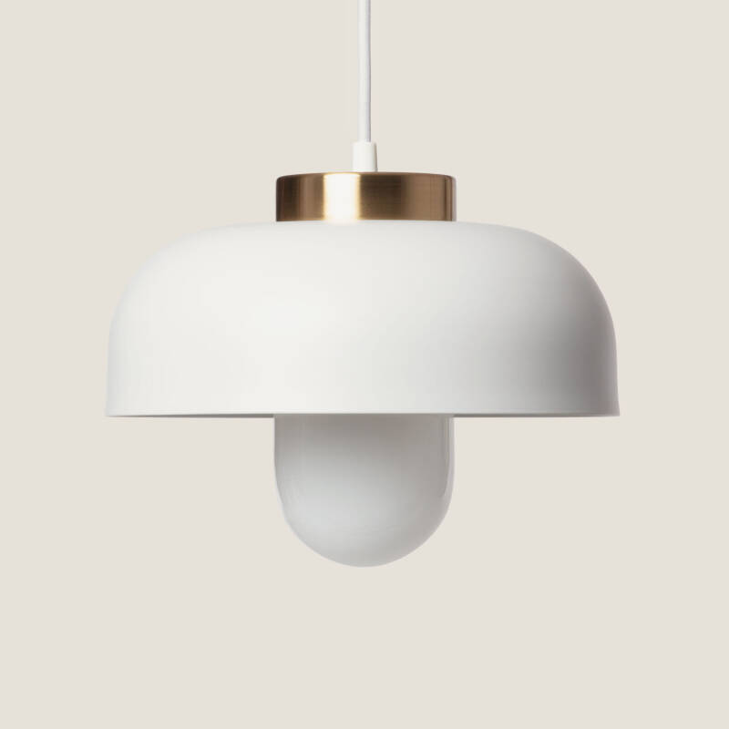 La Lampada Sospensione Metallo Geri è realizzata con un rosone in metallo rifinito in bianco e un paralume uniforme in metallo e vetro che pende da un cavo tessile bianco. Lo schermo è accompagnato da una lente in vetro che copre completamente la lampadina, fornendo così un'illuminazione unica e chiara.
