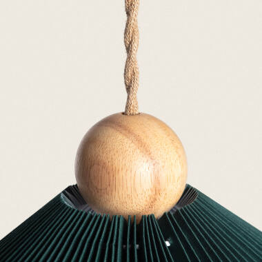 Questa lampada è dotata di un rosone in legno, un cavo intrecciato con filo naturale e una sfera in legno, attaccata al portalampada in colore dorato satinato, che dona un tocco divertente e personale al design finale. D'altra parte, abbiamo il paralume, realizzato in tessuto rinforzato, che ricorda le tecniche di origami nel design finale.