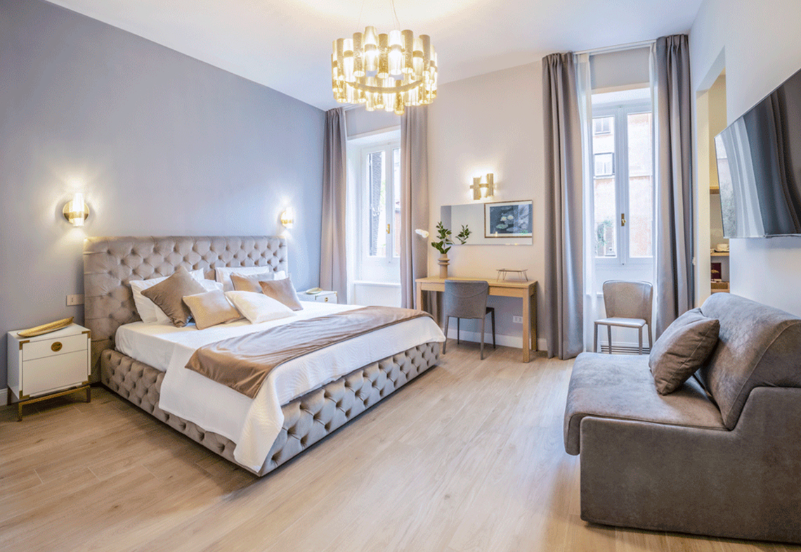 Le suite Vivi Trevi Luxury si trovano nel cuore di Roma. Sono spazi eleganti e ambiti, illuminati da lampade a sospensione e applique della collezione La Lollo Gold.